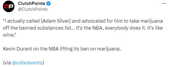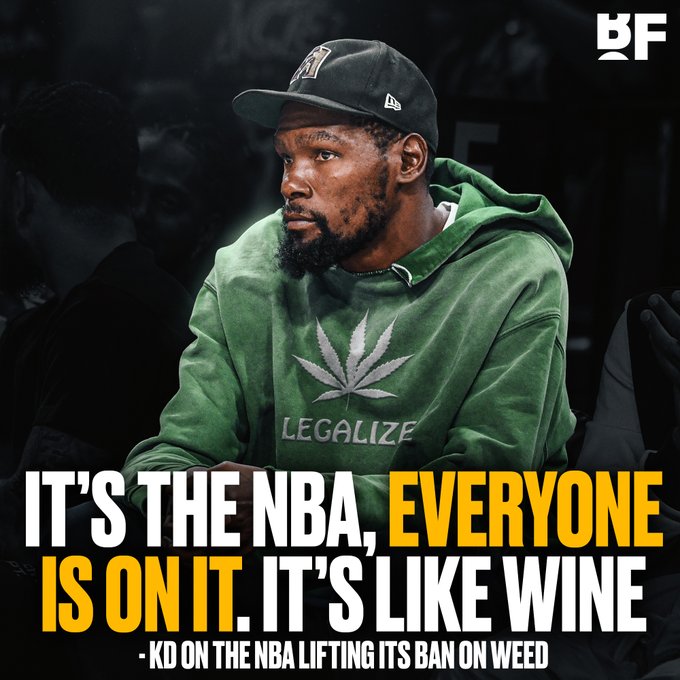 178直播讯07月26日,太阳球星凯文-杜兰特在节目中谈到联盟解除大麻禁令这件事,杜兰特表示:事实上,我打电话给联盟总裁(亚当-萧华),主张他把大麻从违禁物质名单上删除,我觉得全世界到处都有,它不会给你造成负面影响,这是NBA,每个人都这么做,这就像葡萄酒一样。