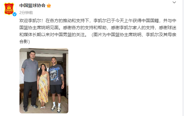 中国篮协官宣:欢迎李凯尔!在各方的推动和支持下,李凯尔已于今天上午获得中国国籍,并与中国篮协主席姚明见面。感谢各方的支持和帮助,感谢李凯尔家人的支持,感谢球迷和媒体长期以来对中国男篮的关注。