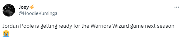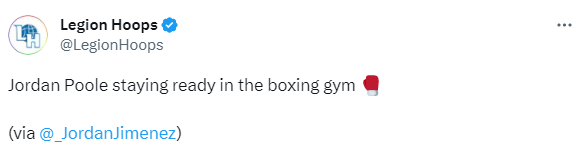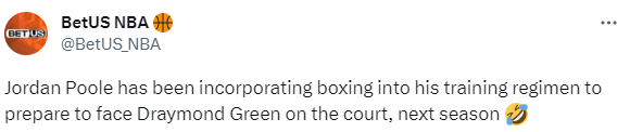 普尔苦练拳击引热议,美媒直言德拉蒙德-格林要小心了,还有美媒表示普尔已经为下赛季在球场上对阵格林做好了准备;库明加的球迷Joeyb表示普尔为新赛季奇才对阵勇士准备好了;还有球迷调侃普尔会在拳击格林时使用右勾拳。