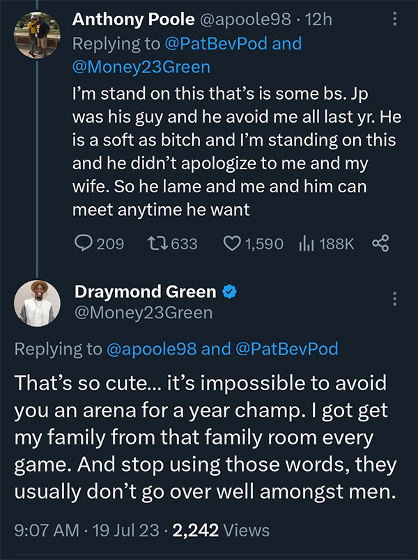 之后追梦直接回复普尔父亲,格林回应:真有点搞笑了……在同一个球馆里一年时间都避开你是不可能的,冠军。我每场比赛都去家属室接自己的家人。另外,别用这些词(脏话)了,这些脏字在男人之间的沟通中通常不会起到什么好的作用。