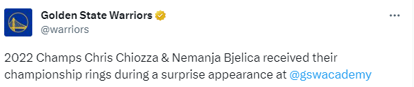 今日,奇奥萨和别利察来到勇士训练馆参观青少年训练营,勇士队为他们举行颁发戒指的仪式,小球迷为他们送上戒指,奇奥萨和别利察都十分开心,冲着镜头展示总冠军戒指,现场球迷为他们鼓掌欢呼;奇奥萨和别利察戴着戒指和总冠军奖杯合影。