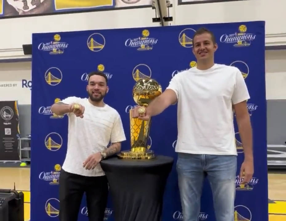 178直播讯07月20日勇士2022年夺冠成员克里斯-奇奥萨和内马尼亚-别利察正式领取属于他们的总冠军戒指,现场小球迷为他们欢呼,勇士两大旧将展示戒指并且戴上戒指合影留念,2022年NBA总冠军奖杯也在现场。