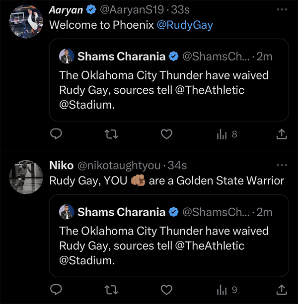 178直播讯07月20日据名记shams报道,雷霆已经裁掉了老将鲁迪-盖伊,盖伊暂时失业,太阳和勇士球迷都招募他,据此前报道,勇士有意引援他。