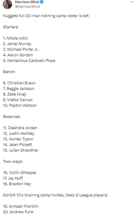 5名保障合同球员:约基奇、穆雷、小波特、戈登、波普、雷吉-杰克逊、贾斯汀-霍勒迪、小乔丹、纳吉、布劳恩、朱利安-斯特劳瑟、泰勒-沃特森、钱查尔、杰伦-皮克特、亨特-泰森;