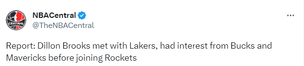 球迷问:为了得到狄龙-布鲁克斯,火箭给他送出了一份丰厚、全额保障的四年合同,他们和谁竞价了呢?他的年薪高于市场价,还有合同期限(长),且没有球队选项。