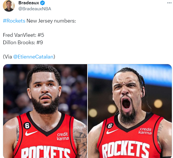 新赛季,狄龙将会改穿火箭9号球衣,该号码的上一个主人是克里斯托弗(已被交易到灰熊),范弗利特则改穿火箭5号球衣,在此前为猛龙效力的7个赛季,范弗利特都是身穿23号球衣,可火箭队的23号(卡尔文-墨菲)已经退役。