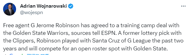 178直播讯07月18日,据espn名记woj报道,NBA自由球员杰罗姆-罗宾逊已同意与金州勇士队达成训练营协议,他将争夺勇士队的一个空缺名额;罗宾逊曾是快船队的乐透秀,过去两年效力于勇士发展联盟的圣克鲁兹队。