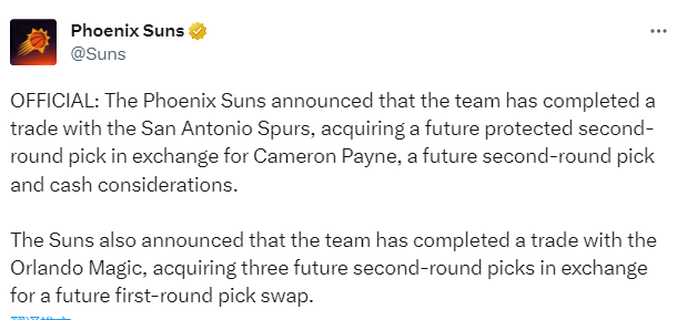 太阳还官宣与奥兰多魔术达成交易,送走一个未来首轮选秀互换权,从魔术得到三个未来次轮权;据悉,太阳队送出2026的首轮互换权,交易得到魔术队的三个次轮签,这三个次轮签为2024年来自掘金队的次轮签+2026年活塞队、魔术队、雄鹿队中最低顺位的次轮签+2028年凯尔特人队的46-60顺位的次轮签。