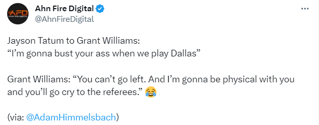 据凯尔特人队记Adam Himmelsbach报道,上周塔图姆与其好友、前绿军球员格兰特-威廉姆斯在拉斯维加斯一家豪华餐厅共进晚餐——塔图姆对格威打趣:当我们对阵独行侠的时候,我会打得你落花流水。
