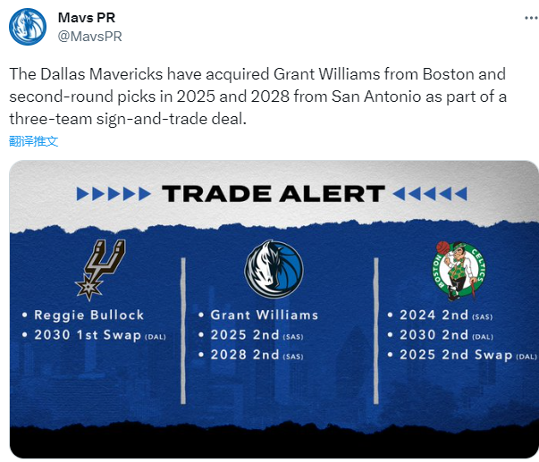 独行侠官方宣布,与凯尔特人、马刺的三方交易正式达成,这笔签换交易的细节如下——