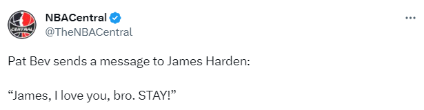谈到来到费城的原因,贝弗利表示哈登就是他来这的原因之一,并且直接喊话:詹姆斯(哈登),我爱你,兄弟,留下来!”