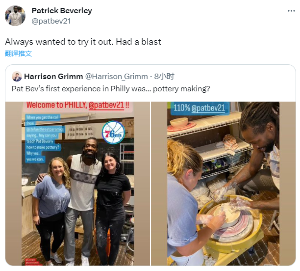 贝弗利来到费城之后还玩起了陶器制作,他转发动态并且写道:一直想尝试一下,玩得很开心!!
