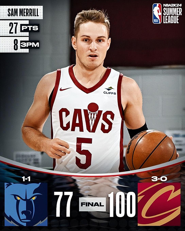 178直播讯07月11日,在NBA夏联骑士100-77大胜灰熊的比赛中,骑士首发后卫萨姆-梅里尔打出疯狂一战,全场出战21分钟,13投9中、三分11中8狂砍27分2篮板2助攻1抢断;米切尔、加兰等人观战,贝茨也打出高效一战。