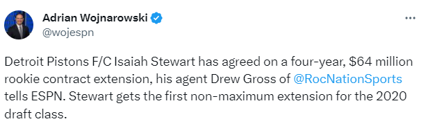 178直播讯07月11日据espn名记woj报道,活塞已经和以赛亚-斯图尔特达成一份4年6400万美元的续约合同,斯图尔特成为2020届新秀众第一个非顶薪提前续约合同的球员;斯图尔特曾和詹姆斯发生冲突,因追打詹姆斯被联盟禁赛2场比赛。