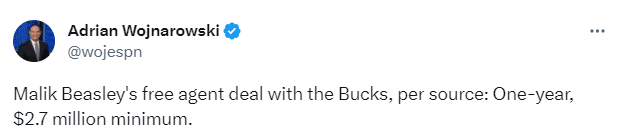 名记Woj报道,自由球员马利克-比斯利1年270万底薪加盟雄鹿,此前湖人拒绝执行了比斯利23-24赛季1650万美元的球队选项,并有意将其带回球队;太阳、勇士等队都有意比斯利,最终比斯利决定加盟雄鹿,辅佐字母哥冲击总冠军。