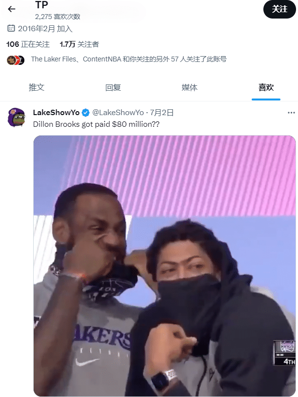 美媒NBA Central发推写道:湖人新援普林斯偷偷嘲笑狄龙-布鲁克斯获得4年8000万美元的大合同。