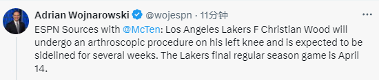 178直播03月19日,湖人内线球员伍德的伤情更新,据espn名记woj报道,伍德将接受左膝关节镜手术,预计缺阵数周。