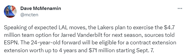 名记Dave Mcmennamin报道,正如预期那样,湖人计划执行范德比尔特新赛季价值470万美元的球队选项,24岁的范德彪有资格在9月8日后和湖人续签最高4年7100万美元大合同。