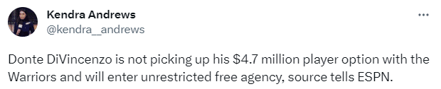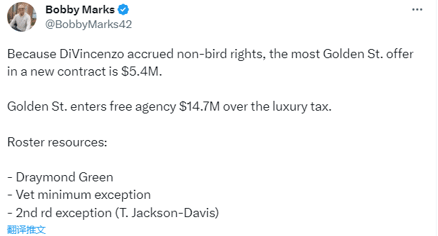 迪文岑佐拒绝执行最后一年合同,目标冲击一份千万年薪的新合同,薪资专家Bobby Marks跟进报道,勇士拥有迪文岑佐的非鸟权,下赛季最多能提供540万美元(新合同起薪最高540万)。