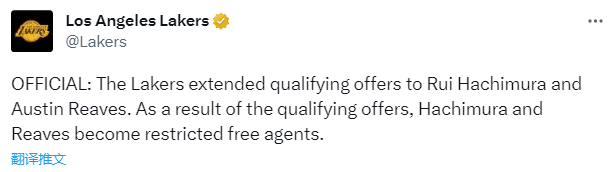 湖人官方正式宣布,球队已为八村垒&里夫斯提供资质报价,二者成为受限自由球员;根据受限制自由球员规则,湖人可以匹配其他任何球队对里夫斯和八村垒开出的合同报价,这是湖人决定和他们续约的第一步。