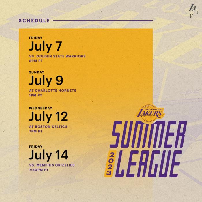 湖人夏季联赛赛程,四场比赛的时间分别是7月8日上午11点对阵勇士;7月10日凌晨4点对阵黄蜂;7月13日上午10点对阵凯尔特人和7月15日上午8点30分对阵灰熊;对于众多二轮秀和落选秀来说,这是他们证明自己的好机会。