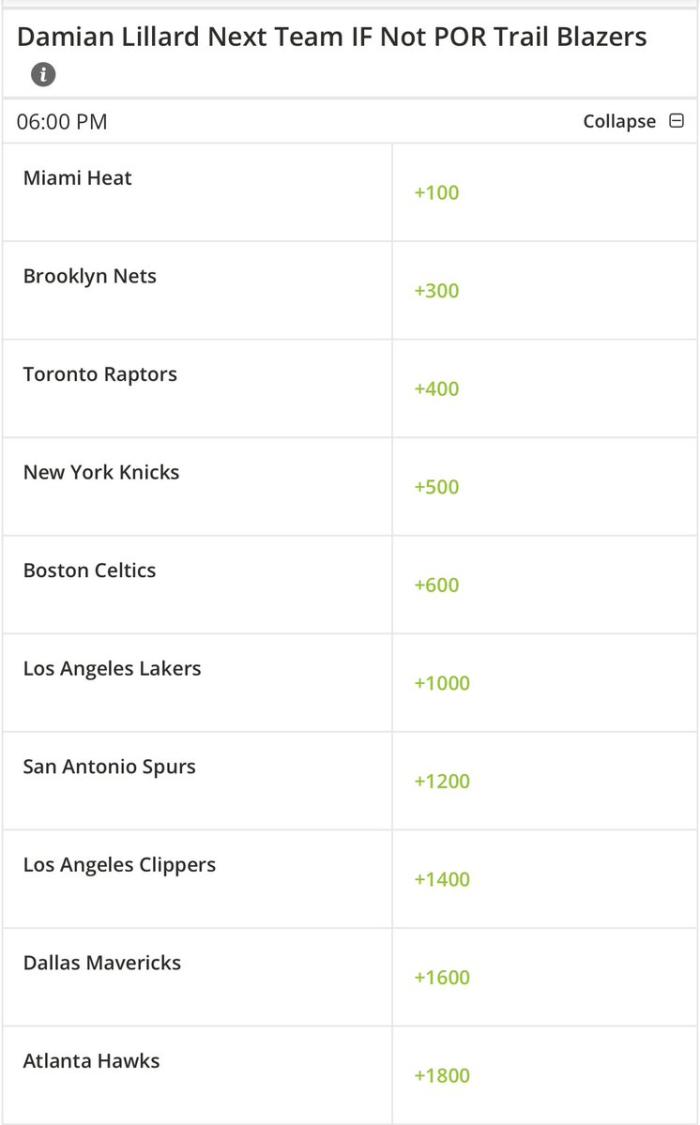 利拉德直播听歌“欢迎来到迈阿密”引热议,有球迷直言100%可以确认利拉德将加盟热火;美媒列出利拉德最新下家赔率,若离开开拓者,热火(+100)是利拉德头号下家,另外篮网(+300)、猛龙(+400)、尼克斯(+500)、凯尔特人(+600)、湖人(+1000)、马刺(+1200)、快船(+1400)等队也在列。