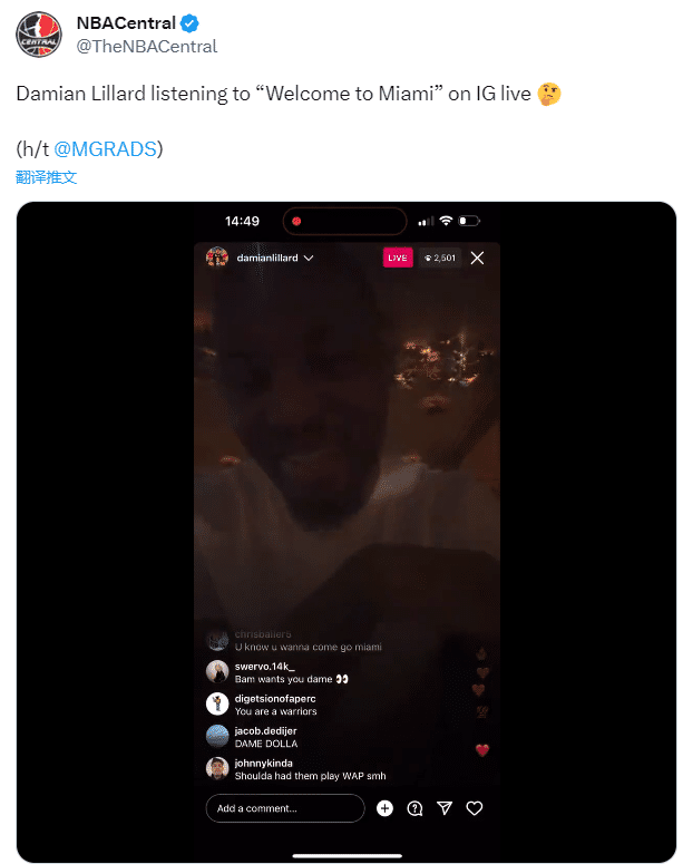 178直播06月24日讯 ,利拉德在派对上直播时听歌,背景音乐是欢迎来到迈阿密;现场有人大笑,利拉德跟着露出笑容,难道利拉德真要加盟热火吗?名嘴列利拉德1换6加盟热火的交易方案,不过开拓者总经理明确表态:没有兴趣交易利拉德。