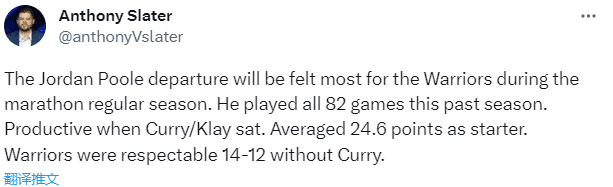 勇士记者Anthony Slater发推写道:普尔离开将对勇士漫长的常规赛造成严重影响。上赛季,普尔打满82场,当库里、克莱无法出战时他效率很高。首发时,他场均24.6分。在没有库里的情况下,勇士打出了14胜12负的战绩。