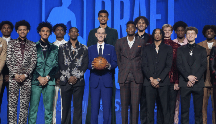 在NBA选秀日,文班亚马身穿一套墨绿色的西装,盛装出席帅气亮相并且与亨德森热聊,还为球迷签名球衣和篮球以及和球迷拍照合影;期间文班亚马接受采访时,他表示进入NBA后最想和杜兰特交手;等到2023年选秀正式开始,最终19岁文班亚马被马刺用状元签选中,现场拥抱家人庆祝并且喜极而泣。