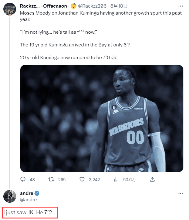 有网友引用穆迪谈论库明加的言论,表示:我没说谎,他现在跟xx一样高;19岁,库明加来勇士时2米05;20岁的库明加现在传闻2米13。