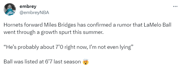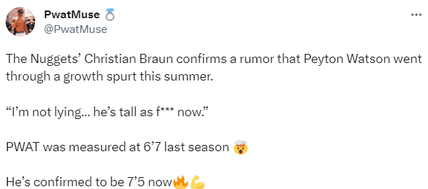 目前库明加的官方身高是2米01,难道库明加突然长高了17厘米吗?如此消息确实令人不敢相信,库明加比普尔高出很多以及沃特森比约基奇高很多的P照都来了。另外还有人故意造谣,黄蜂球星三球已经从6尺7(2米01)长到7尺(2米13);掘金菜鸟沃特森从2米03长到2米26。