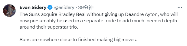 名记woj揭秘——在这笔交易中,比尔放弃执行了交易否决权,但否决权仍将随着他一同前往太阳队当中,这笔交易可能需要几天才能正式完成;太阳的领导层和球队的关键球员们,这几天一直都在不间断地想要比尔来到球队,以此来实现赢得总冠军的愿望。