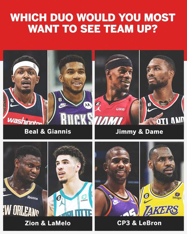 178直播讯06月17日,ESPN发布了一组照片,暗示在今年夏天可能出现的4大巨星换队。他们分别是字母哥+比尔,巴特勒+利拉德,锡安+鲍尔,保罗+詹姆斯。那么这4组双巨头组合,最终是否有机会成行呢?如果最终成行,搭配效果又是如何?