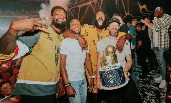178直播讯06月17日,掘金众将现身夜店狂欢庆祝夺冠,现场画面曝光,约基奇、戈登、穆雷、小布朗等人都来到赌城夜店狂欢,约基奇彻底玩嗨了;掘金悍将布朗更是喝醉了,自曝眼部伤得很重,直播责怪约基奇把他灌醉了。