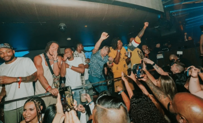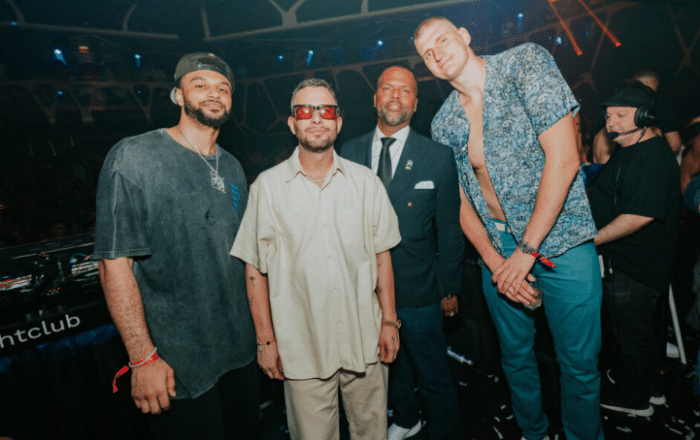 约基奇身穿花衬衫并且解开上衣的纽扣,在赌城夜店疯狂蹦迪狂欢,现场氛围太嗨了,掘金众将喝酒、跳舞嗨翻天,穆雷、戈登、小波特、杰夫-格林、波普、小布朗、小乔丹以及掘金老板等人都来了。