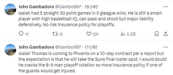 2014-15赛季,小托马斯曾为太阳出战46场常规赛,场均得到15.2分2.4篮板3.7助攻1抢断;小托马斯上一次打NBA是在2022年4月11日,生涯至今曾为湖人、凯尔特人等球队效力过,曾2次入选全明星。