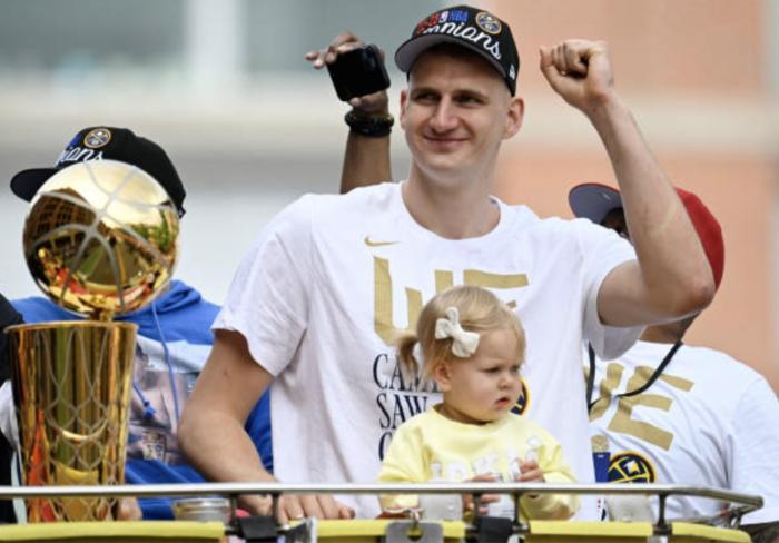 在夺冠游行期间,有球迷向大巴上扔啤酒,约基奇老婆的面部被啤酒砸到,而且差点砸到约基奇的女儿,当时约老师明显不开心了,十分担心爱妻,所幸没有破相,约基奇的老婆继续向球迷打招呼。