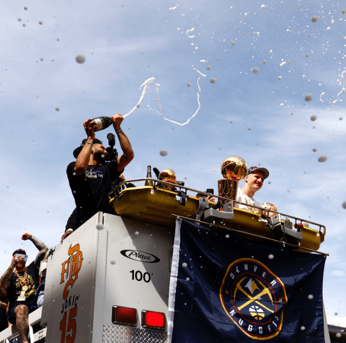 178直播讯06月16日,掘金队正式举办夺冠游行庆典,现场出现意外,约基奇妻子的面部被砸到,所幸未受伤;究竟现场有多火爆?掘金球迷挤满路两侧,马龙、穆雷狂喷香槟以及波普对瓶吹嗨翻天,小布朗、布劳恩等人赤膊亮相。