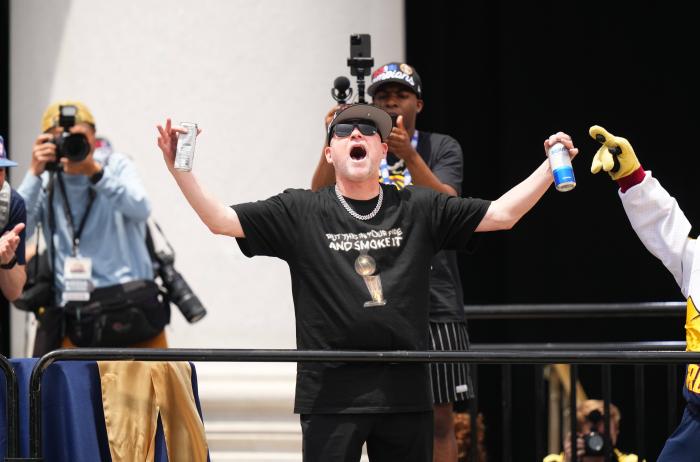 穆雷也身穿定制T恤出境,划掉“季后赛穆雷”和“总决赛穆雷”,改成了总冠军穆雷;穆雷抽雪茄以及狂喷香槟,同样玩嗨了。