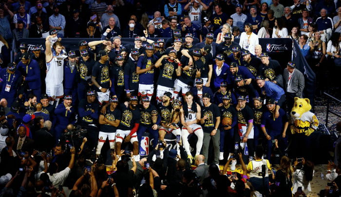 178直播06月13日NBA总决赛落下帷幕,掘金在G5主场逆转击败热火,大比分4-1拿下队史首座NBA总冠军奖杯。掘金建队47年后夺队史首冠,成目前用时最长的总冠军球队,非常不容易,约基奇首度率队打进总决赛就夺冠,表现强势,他个人以全票的成绩斩获FMVP,实至名归。马龙在颁奖仪式期间表示不满足这一个总冠军,豪气冲天。掘金夺冠,更衣室成为欢乐的海洋。