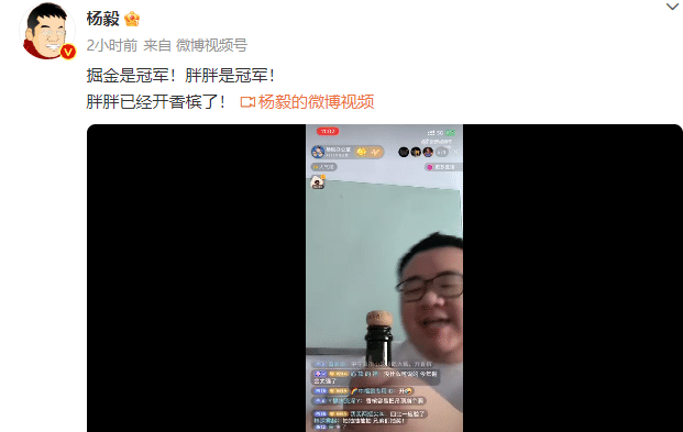 掘金夺得总冠军,杨毅团队也在开直播,员工直接开香槟进行庆祝,开了香槟之后直接往嘴里倒,结果喷了出来,杨毅等人在一旁大笑。杨毅配文称:“掘金是冠军!胖胖是冠军!胖胖已经开香槟了!”