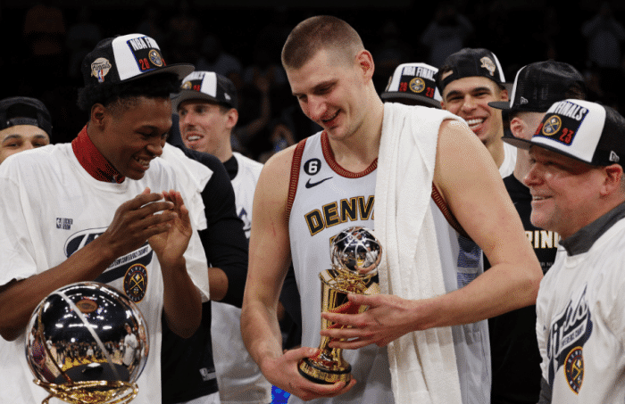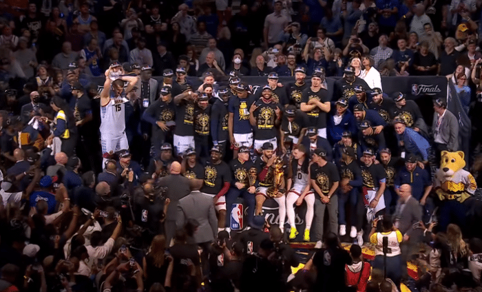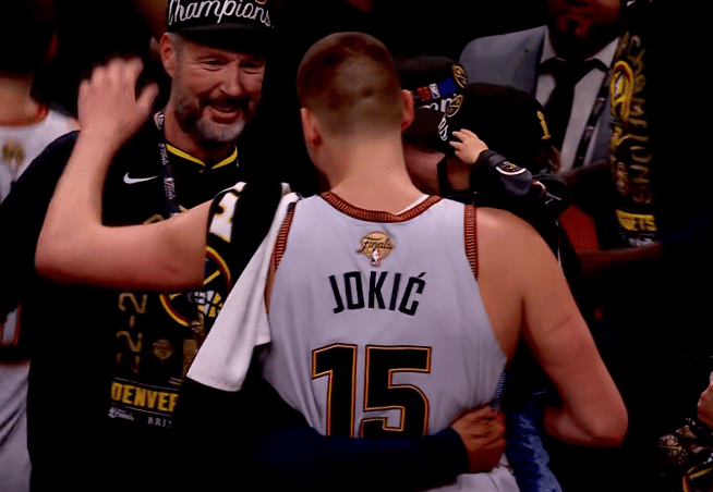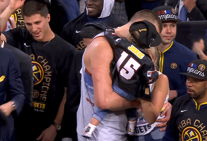 G5夺冠一战,在全队外线失准的情况下,约基奇统治禁区,带队逆转取胜,总比分4-1淘汰热火从而夺得56年队史第一座总冠军;掘金夺冠后全队疯狂庆祝,约基奇抱着孩子拥抱众人,约基哥哥直接抱起岳老师庆祝;穆雷激动落泪。