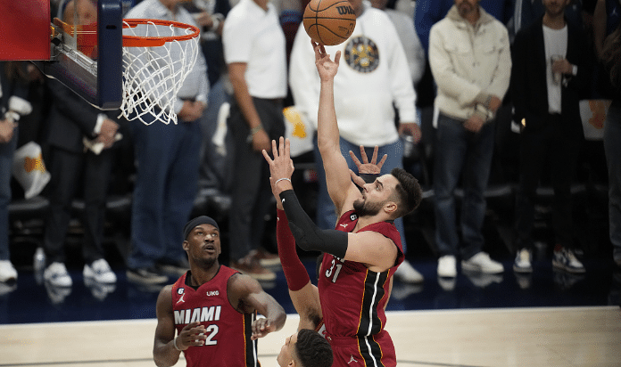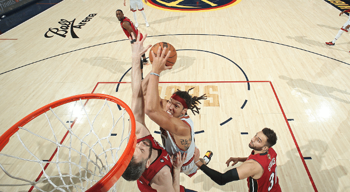 第二节,首节0分的巴特勒开始发力,连得4分。乐福大帽小波特,布劳恩上篮得分,巴特勒两罚全中,布朗上篮放进。戈登3次犯规陷入到麻烦中,邓罗里突外投连得5分,热火领先两位数。约基奇和波普连得4分,布朗反击暴扣,掘金在约基奇的带动下来连得6分,缩小比分差距。