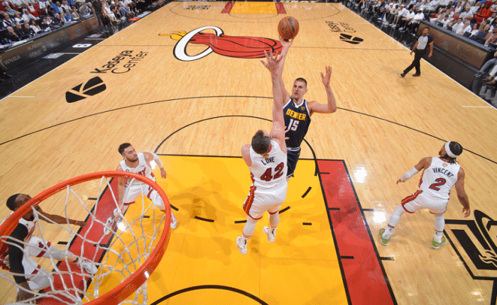 比赛正式开打,阿德巴约持球扛着约基奇杀到禁区上篮,随后约基奇背打回应2分,乐福防守三秒违例,穆雷罚球得分,紧接着约基奇助攻波普轰进三分,戈登造犯规两罚一中;被打7-0后乐福三分止血,巴特勒助攻阿德巴约抛投,热火回应5-0,两队打成7-7平。