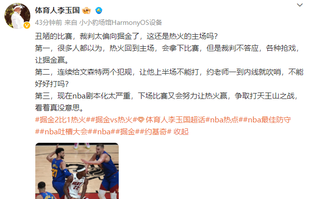 这场比赛的裁判在赛后被认为,主裁判是大名鼎鼎的托尼兄弟,拥有接近200万粉丝的体育人李玉国在社交媒体上怒斥裁判,称太过于偏向掘金,还直言现在的NBA剧本化太严重。李玉国表示比赛中的裁判太抢戏,就是为了让掘金赢球,包括第二节,文森特短时间内被连续吹犯规,约基奇一到内线就吹哨。他还直言下一场会让热火赢,这样就可以打天王山之战。