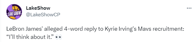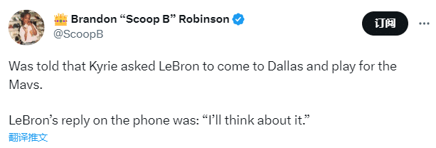 178直播讯06月08日近日欧文招募詹姆斯加盟独行侠的重磅消息引发巨大热议,究竟当时詹姆斯是如何回应欧文的?NBA名记布兰登-罗宾逊爆料,当欧文招募詹姆斯前往独行侠打球时,詹姆斯在电话里回应:我会考虑的(I’ll think about it)。