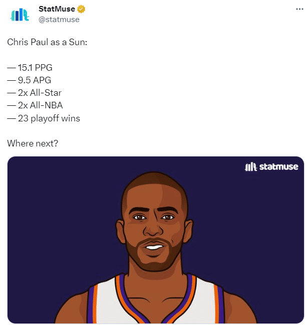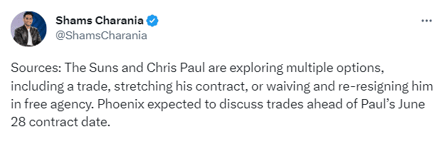 名记Shams补充报道,太阳已经通知克里斯-保罗,他们打算在休赛期找到一个适合这位老将和球队的解决方案,其中可能包括分道扬镳。
