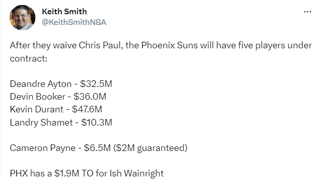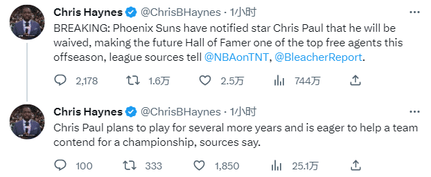 178直播讯06月08日,名记Chris Haynes报道,太阳将裁掉克里斯-保罗并且已经通知后者,保罗计划再打几年,并渴望帮助球队争夺总冠军;shams报道,太阳和保罗将探讨各种选择,woj报道预计太阳将分期支付保罗的合同,后者仍想留在太阳联手杜兰特和布克。