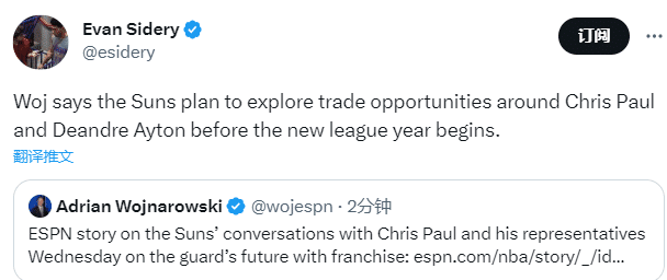 ESPN名记woj进一步报道,太阳仍在探讨关于保罗未来的几个可能性,在保罗的合同截止日前,太阳计划探索包括保罗和艾顿在内的交易,这可能会改变球队的阵容格局。