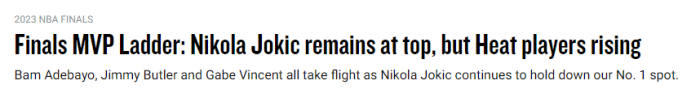 总决赛G1,约基奇轰下三双并且带队取得总决赛开门红,但G2约基奇全场轰下41分11篮板仍输掉比赛,热火采取了尽可能消耗约基奇的策略,约基奇第三节独砍18分却累得瘫坐替补席,狂喝饮料补充体力,末节约基奇贡献10分仍难救主,另外约基奇5次失误比助攻还多。